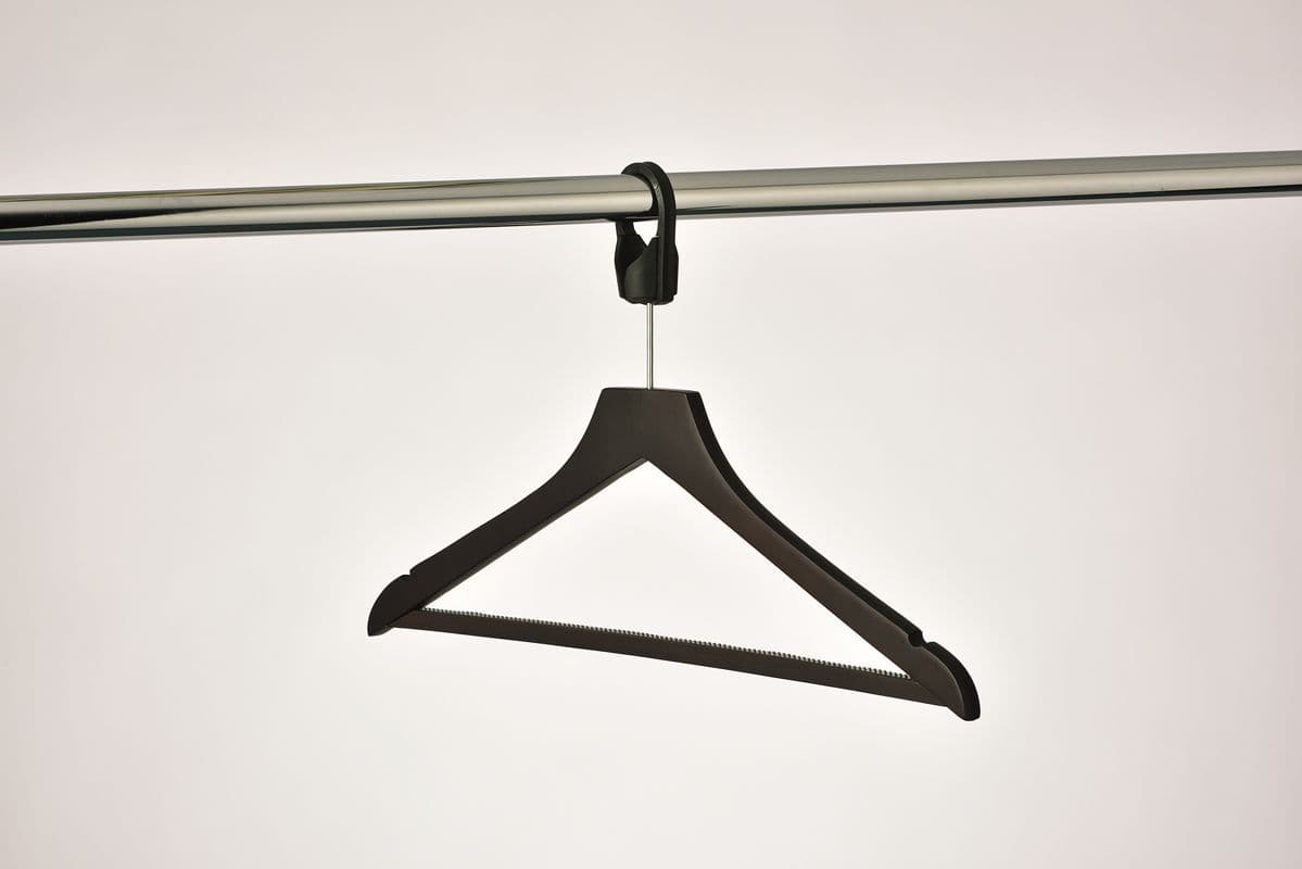A Dark colour wooden hanger with anti-theft nail head, and a security collar. The security collar is supplied in two parts which clip together around the rail, so avoiding the need to remove the rail from the cupboard when putting on the collar. Once installed the collar remains on the rail, but the nail headed hanger can be removed so that it is easier for guests to hang clothes, whilst being of limited value if taken. The hanger is notched to take skirt loops and has a dark rubber anti-slip insert within the trouser bar that tones with the dark colour of the hanger